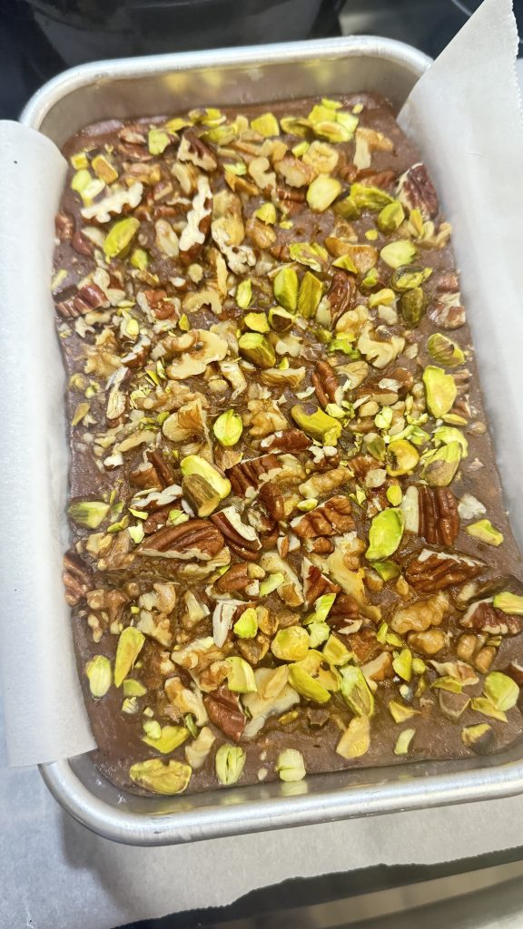 - Chop the walnuts, pecans, and pistachios and place them as the topping.